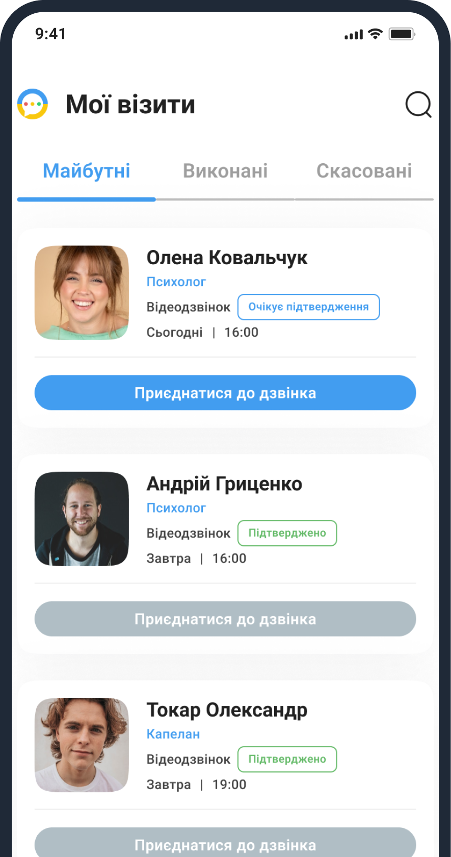 Відеоконсультації з сертифікованими психологами та духовними наставниками в одному мобільному застосунку.