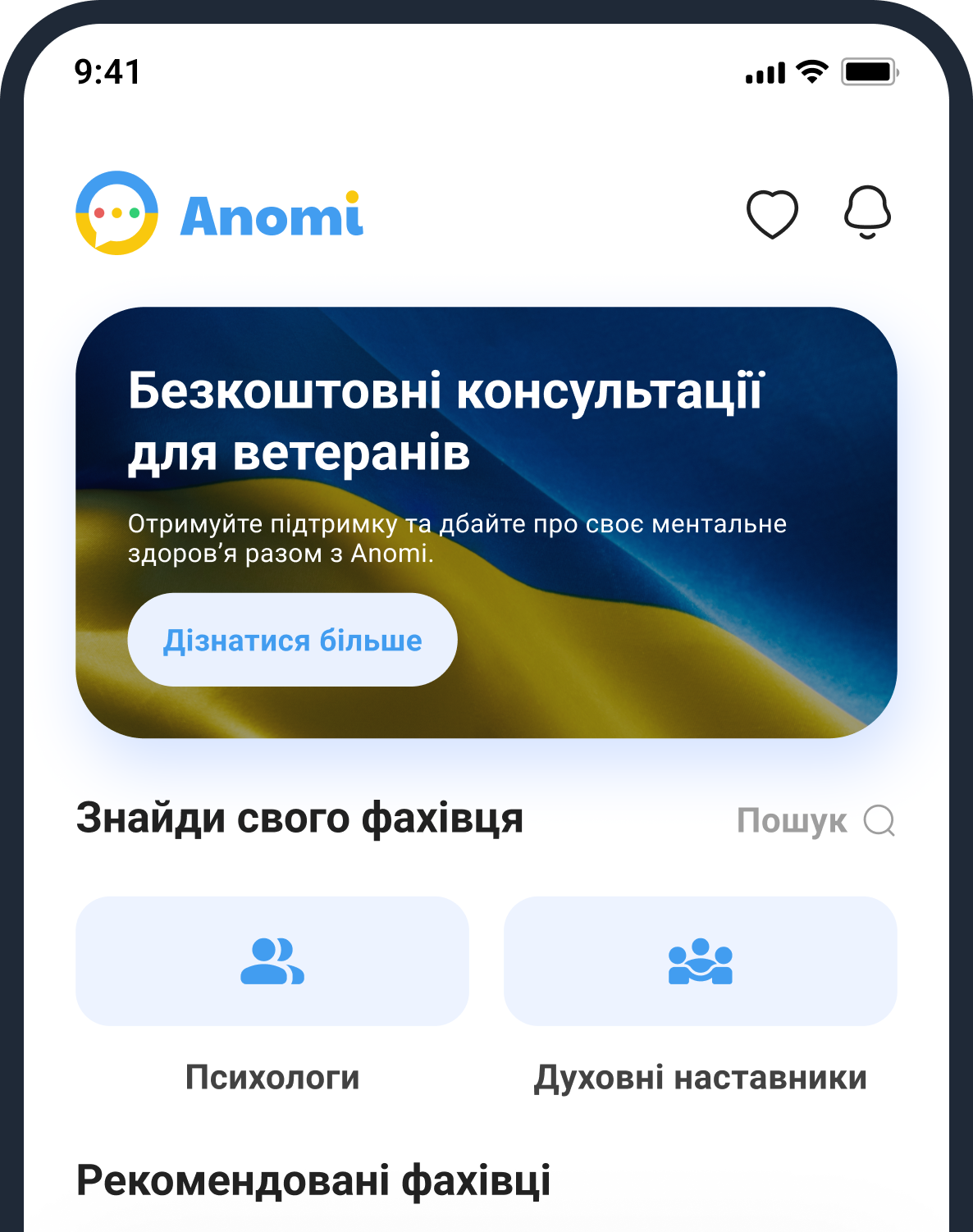 Застосунок безкоштовний для завантаження. Ви платите тільки за проведені сесії з фахівцями. Для ветеранів — безкоштовно.